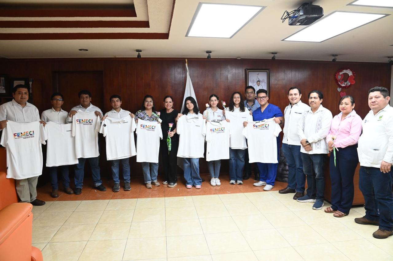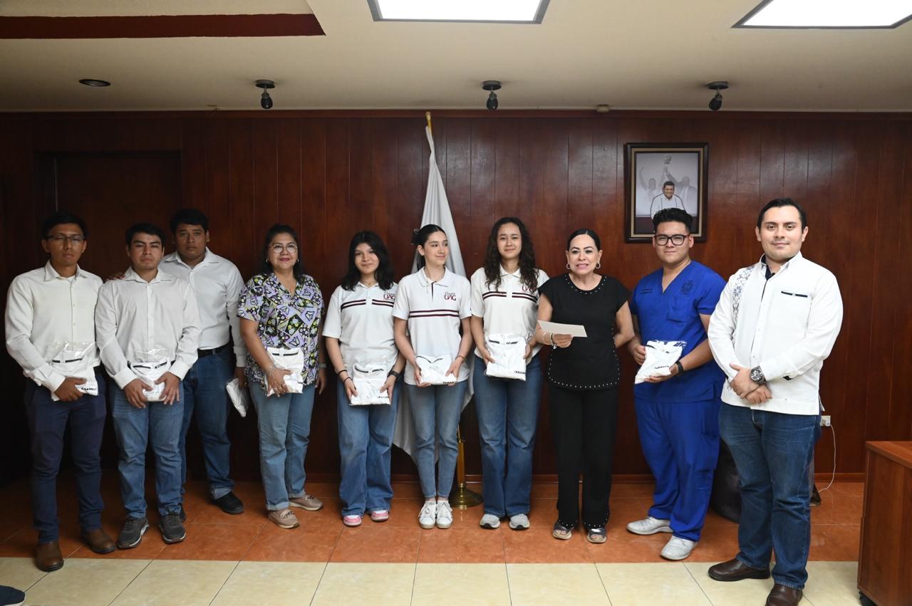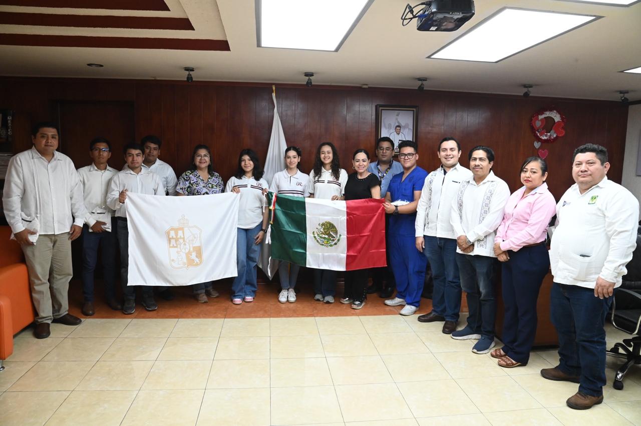 Durante la ceremonia realizada en las oficinas centrales de la SETAB, la funcionaria estatal entregó uniformes y el estandarte de Tabasco a los nueve estudiantes que conforman el equipo, reafirmando que esta administración camina de la mano con la innovación.