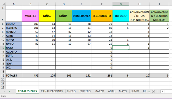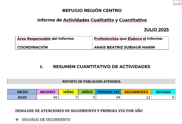 ACTIVIDADES: recepción, orientación, entrevista inicial, aplicación de evaluación de riesgos, apertura de expedientes, canalización a áreas especializadas y registro en plataforma Banavim. visita domiciliaria en Estanzuela, Parilla, Centro, para búsqueda de red de apoyo.