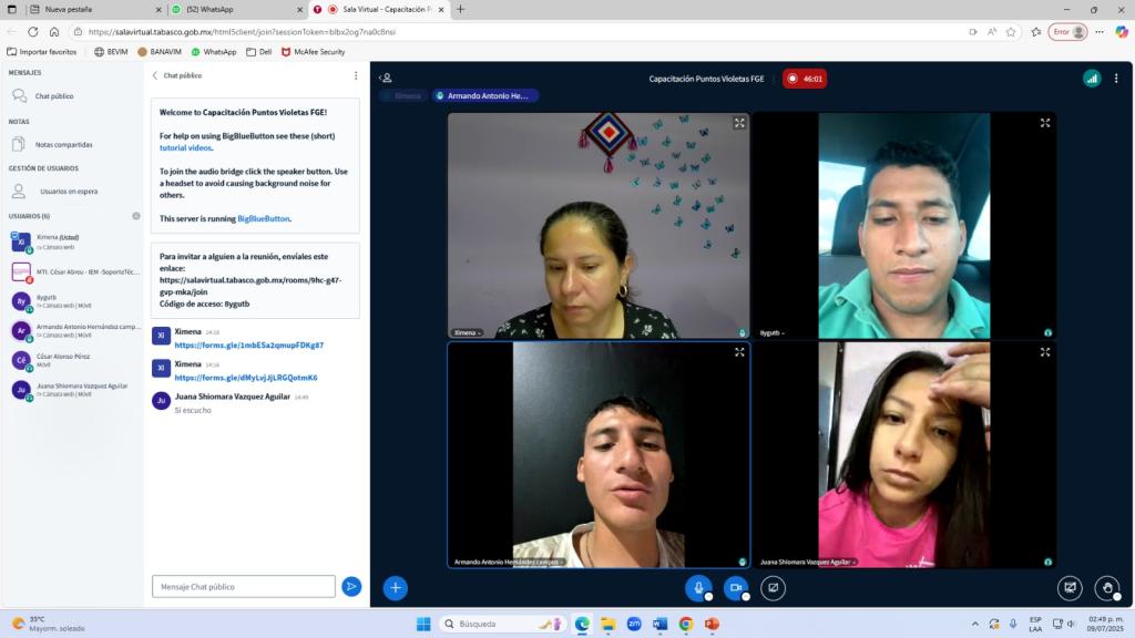 El Instituto Estatal de las Mujeres de Tabasco a trave s del Departamento de Capacitacio n de la Subdireccio n de Psicologí a y Salud Integral realizo jornada virtual de socializacio n del Programa Puntos Violetas impulsado por el Instituto, estuvo dirigida a personal de la Fiscalí a General del Estado de Tabasco, su objetivo fue dar a conocer esta estrategia a quienes sera n los contactos violetas para que puedan consolidarse como espacios seguros para mujeres y nin as ví ctimas de violencia y así conformar una red de apoyo que abone en acciones para la erradicacio n de la violencia de ge nero y contra las mujeres en el Estado de Tabasco. participaron 4 hombres y una mujer, para un total de 5 asistentes.