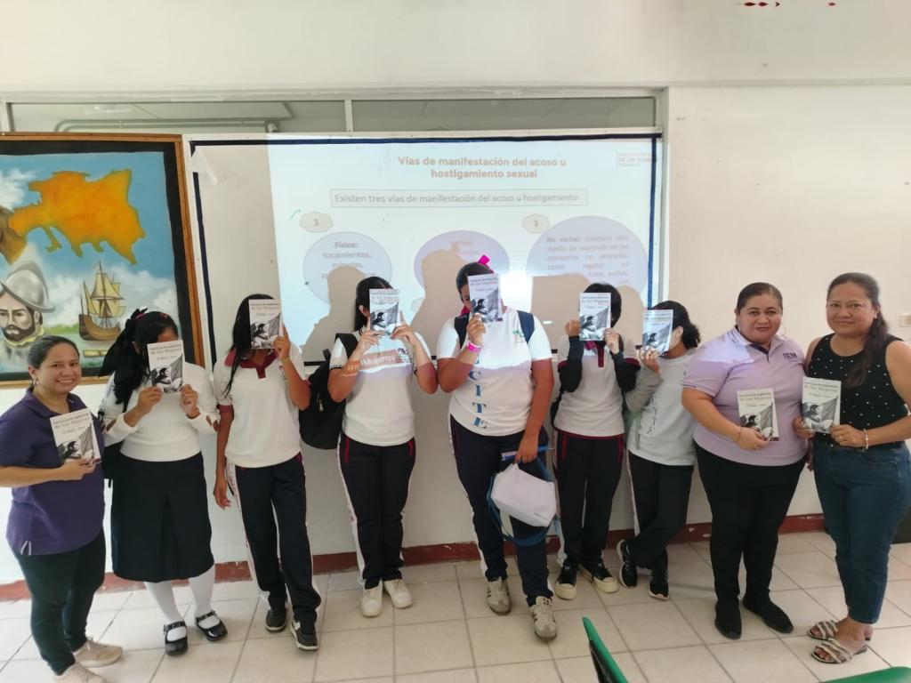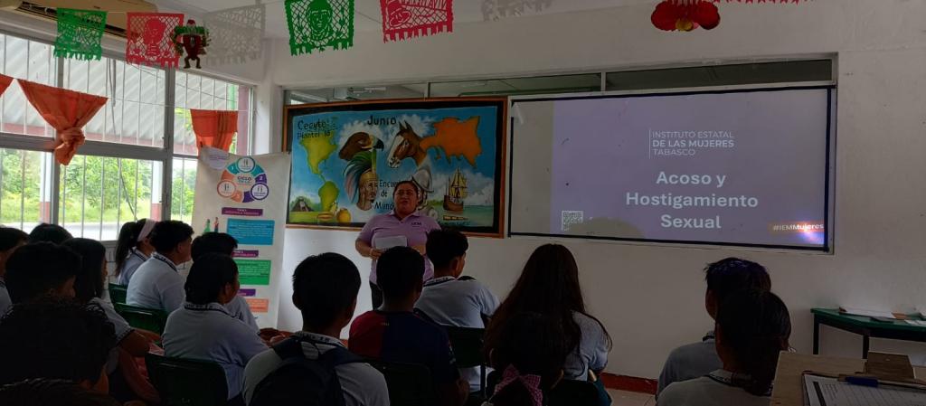 El Instituto Estatal de las Mujeres de Tabasco a través del Departamento de Capacitación de la Subdirección de Psicología y Salud Integral realizó una jornada de capacitación en “Acoso y Hostigamiento sexual” dirigido a estudiantes del CECyTE Plantel 18 de la Ranchería Encrucijada 3ra. Sección, del municipio de Cárdenas, esta tuvo por objetivo sensibilizar desde el enfoque de derechos sobre esta problemática, diferenciar ambos tipos de conductas, enseñar a establecer límites, promover la denuncia y las cero tolerancias a situaciones que violenten sus derechos, para habitar espacios seguros y libres de violencias.
