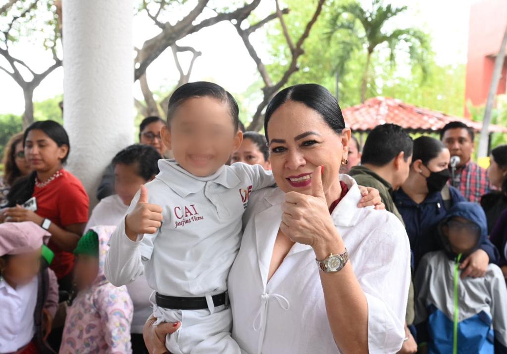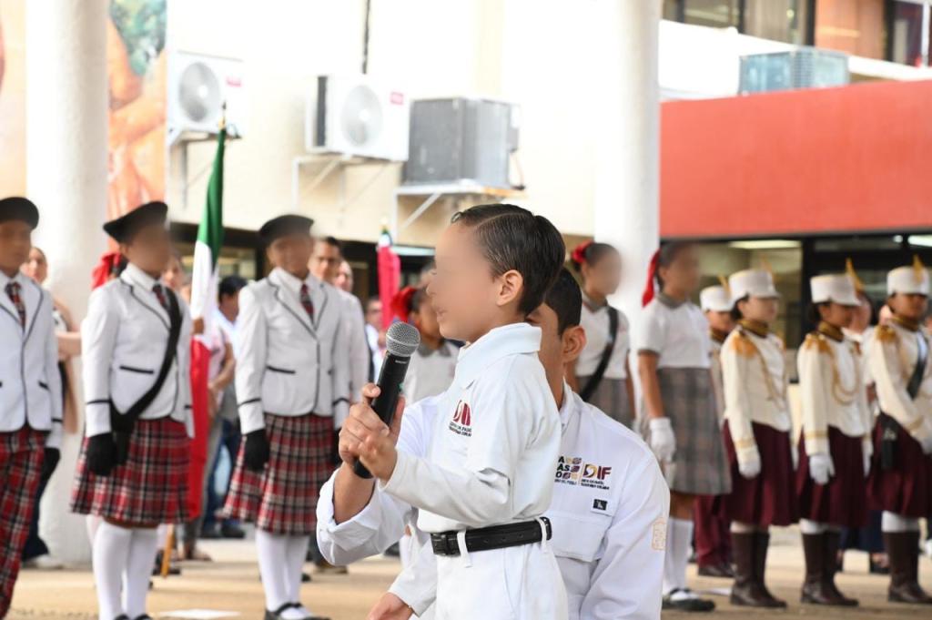 Asimismo, el alumno Mateo Kaleb Gómez Pineda, del tercer grado de preescolar del Centro de Atención Infantil “Josefina Vicens” (Sistema DIF Tabasco), conmovió a las y los presentes con la poesía titulada “Mi Bandera”.