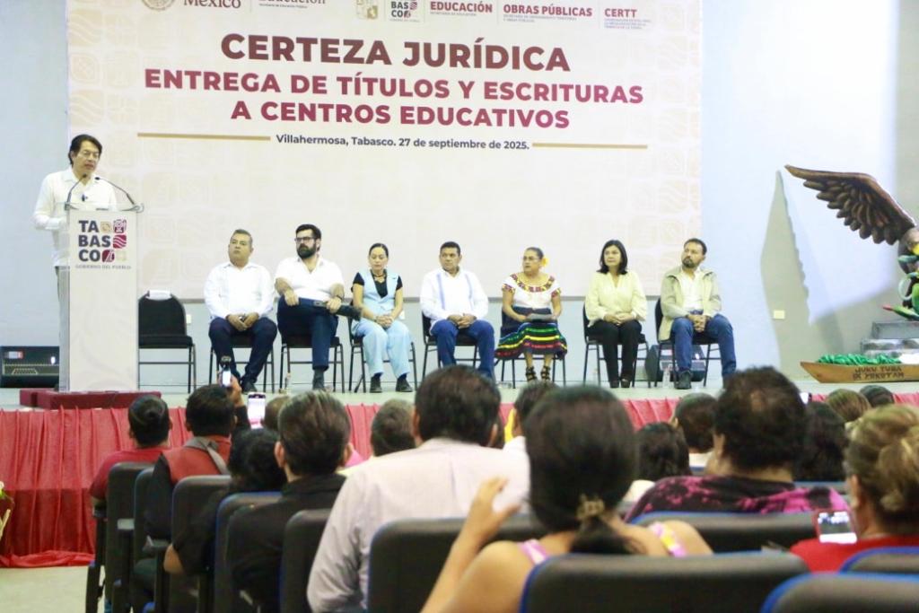 Mario Delgado afirmó que “una escuela con título de propiedad no solo tiene certidumbre legal; tiene rumbo. Esto abre las puertas para que los recursos públicos lleguen con claridad, transparencia y efectividad. Estamos cumpliendo con el mandato de transformar la educación desde su raíz: con infraestructura segura, legalizada y preparada para seguir creciendo. Esa es la base de la Nueva Escuela Mexicana”. El Gobernador Javier May Rodríguez enfatizó que “este programa de regularización responde al compromiso del Gobierno del Pueblo de llevar justicia social y certeza jurídica a nuestras escuelas. No puede haber transformación educativa sin bases firmes. Hoy Tabasco avanza con pasos decididos, asegurando que ninguna escuela quede atrás”.