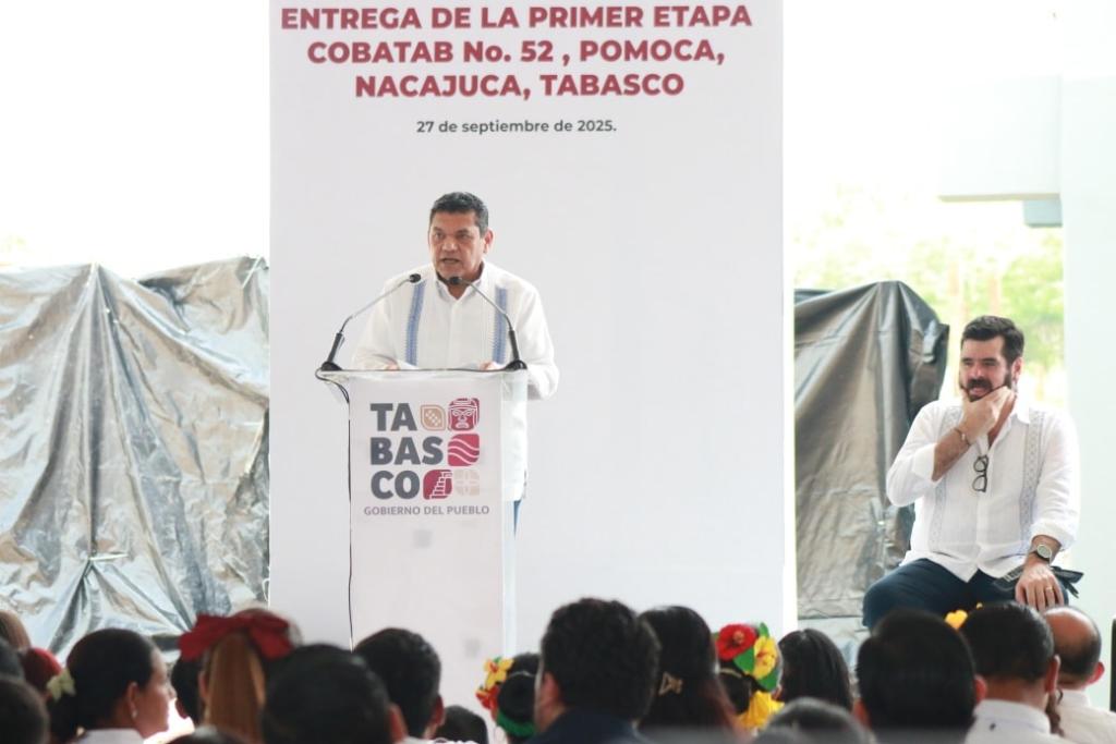 Posteriormente, se entregó la primera etapa del COBATAB Plantel 52, en Pomoca, municipio de Nacajuca, ampliando las oportunidades de acceso a la educación media superior para la juventud de la región. Mario Delgado señaló que “el bachillerato es un momento decisivo en la vida de los jóvenes, donde se construyen conocimientos, habilidades y valores que los acompañarán para toda la vida”. El Gobernador destacó que “cada aula entregada representa un compromiso cumplido con las familias de Tabasco y contribuye al desarrollo educativo de nuestras comunidades”.