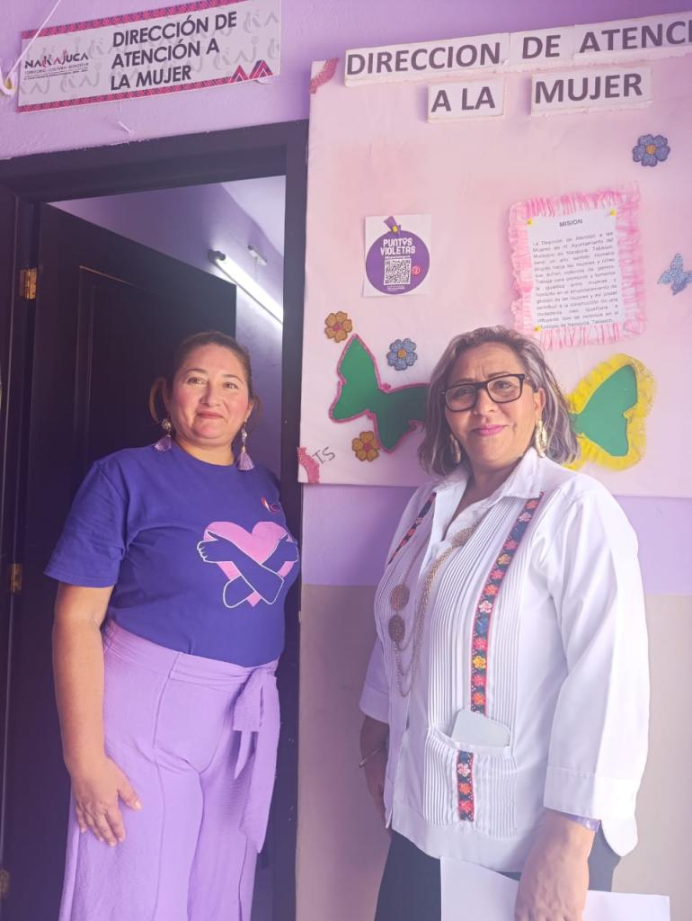 Se realizó la colocación de Puntos Violetas, el día 02 de julio del 2025, mismos que fueron colocados en diversos puntos del municipio de Nacajuca, con el objetivo de crear espacios seguros y de apoyo para mujeres que han sufrido o presenciado violencia machista, ofreciendo información, asesoramiento y, en algunos casos, atención integral, así como buscar sensibilizar a la sociedad sobre la violencia de género y fomentar la participación de toda la comunidad en su prevención y erradicación.