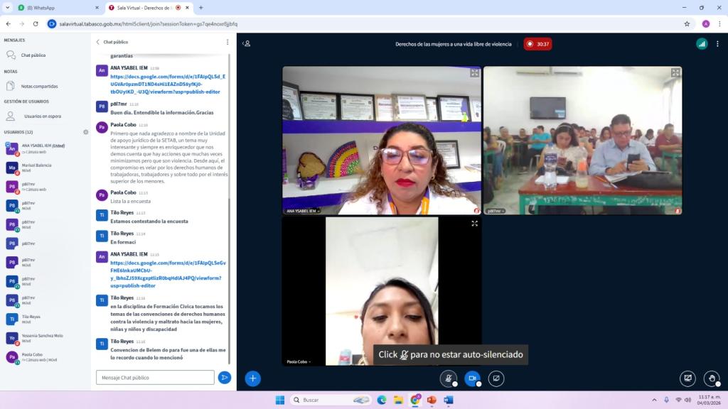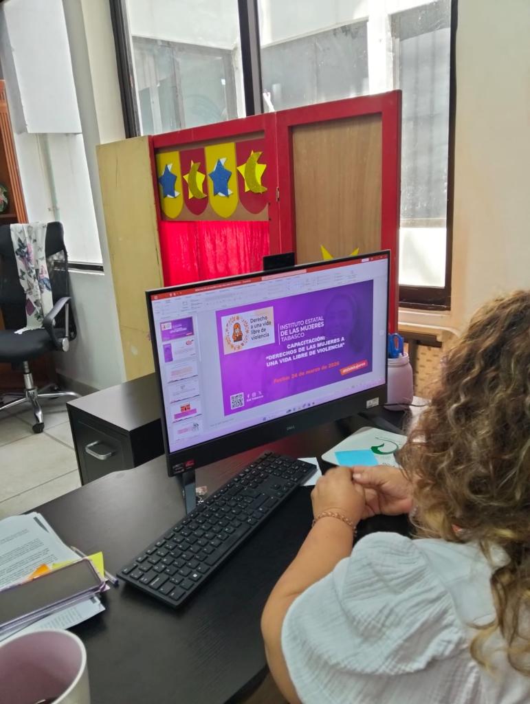 El Instituto Estatal de las Mujeres a través de la Subdirección de Fortalecimiento Territorial, llevó a cabo la Capacitación Virtual: “Derechos de las mujeres a una vida libre de violencia”, el día 04 de marzo de 2026, dirigida a las y los servidores públicos de la Escuela Secundaria Técnica No.8 del Municipio de Comalcalco, Tabasco.