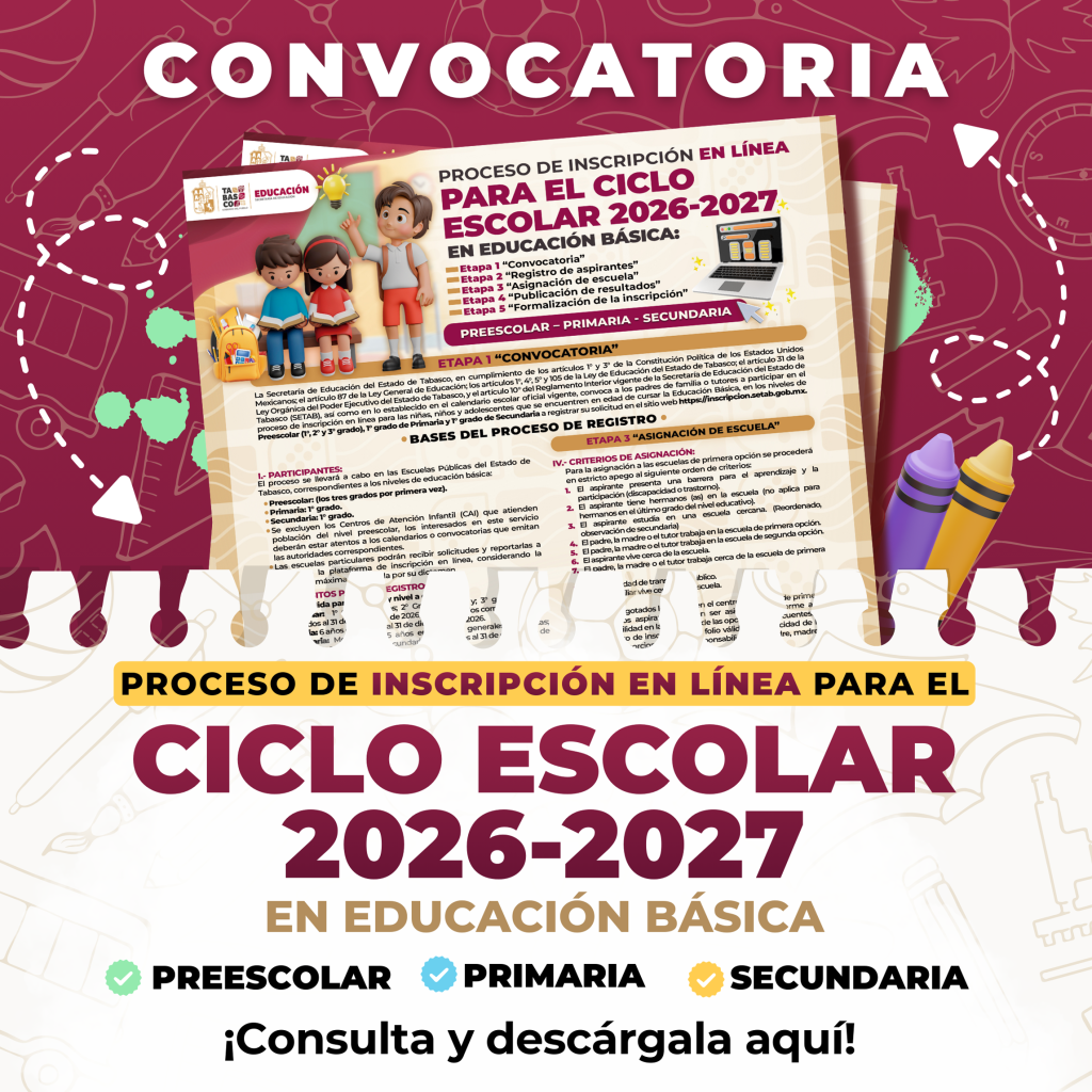 La convocatoria, que está dirigida a padres, madres de familia y tutores de las niñas, niños y adolescentes en edad de cursar educación preescolar, primero de primaria y primero de secundaria en escuelas oficiales de la entidad, puede ser consultada en https://tabasco.gob.mx/.../Convocatoria_pre_12012026.pdf, así como en las cuentas oficiales página Web, Facebook y twitter de la SETAB.
