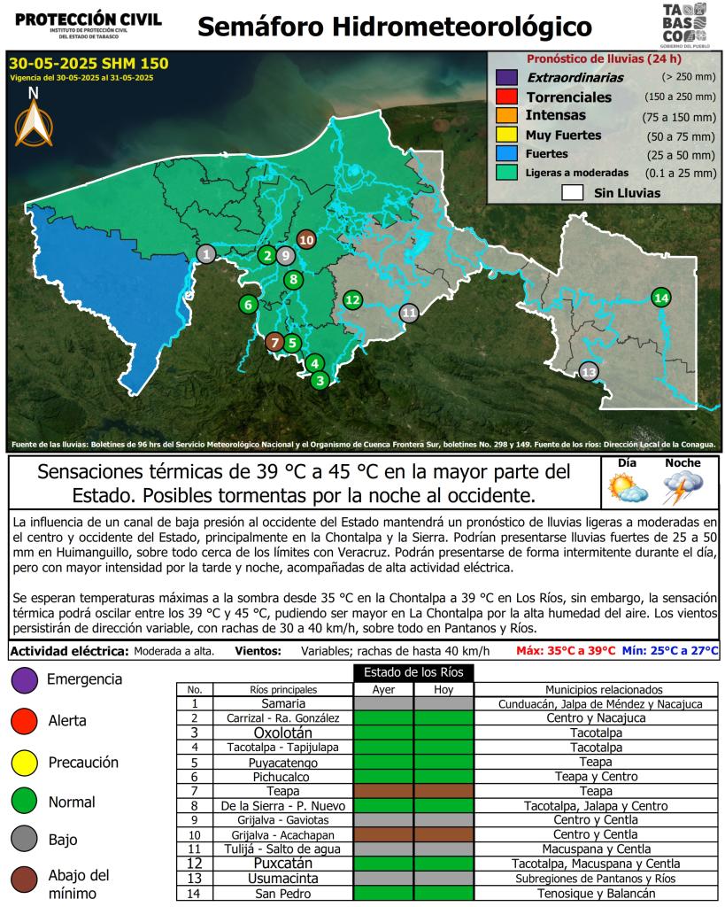 Noticias Compartir en: ¡Enlace copiado! Público General | 30 Mayo, 2025 Semáforo Hidrometeorológico - 30/05/2025