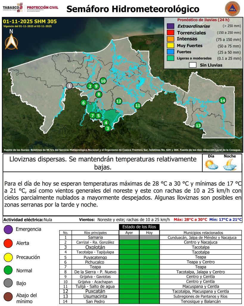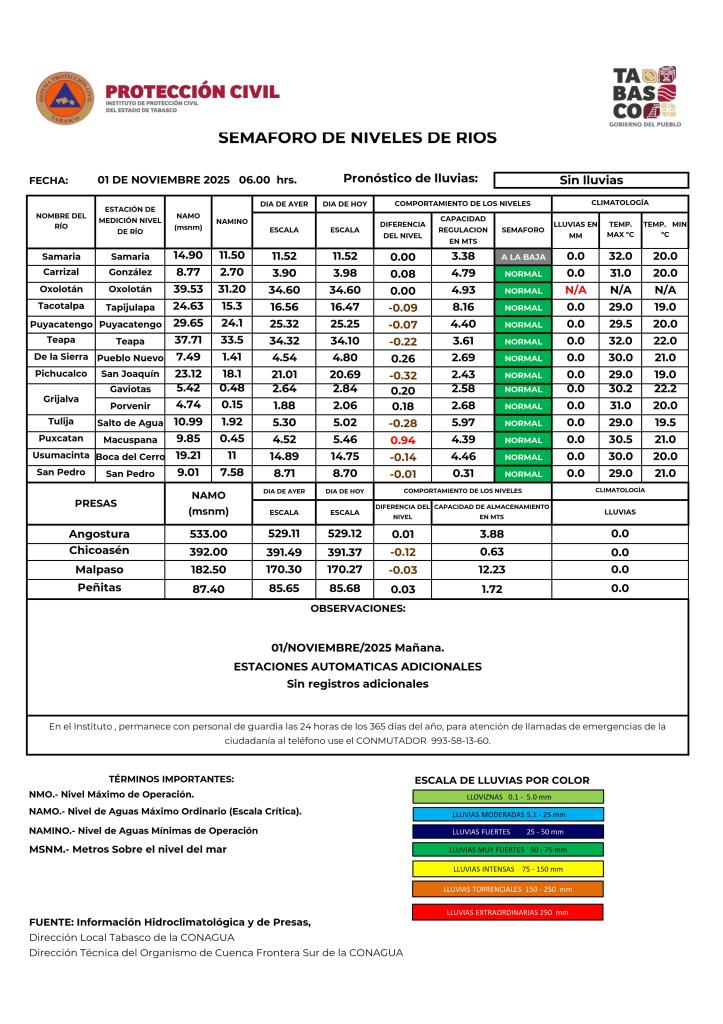 Noticias Compartir en: ¡Enlace copiado! Público General | 1 Noviembre, 2025 Semáforo Hidrometeorológico y Niveles de Ríos - 01/11/2025