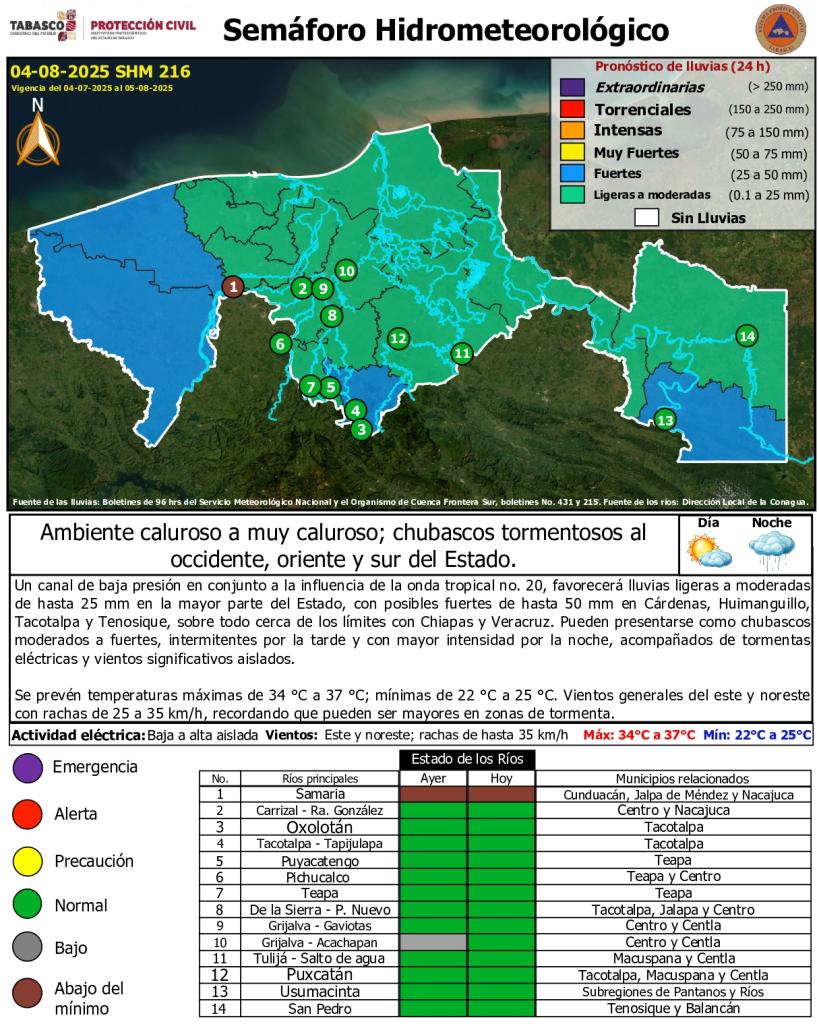 Noticias Compartir en: ¡Enlace copiado! Público General | 4 Agosto, 2025 Semáforo Hidrometeorológico y Niveles de Ríos - 04/08/2025