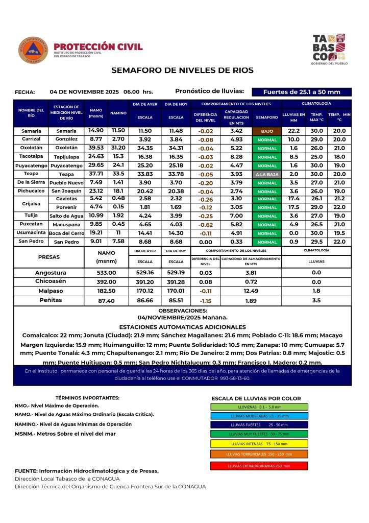 Noticias Compartir en: ¡Enlace copiado! Público General | 4 Noviembre, 2025 Semáforo Hidrometeorológico y Niveles de Ríos - 04/11/2025