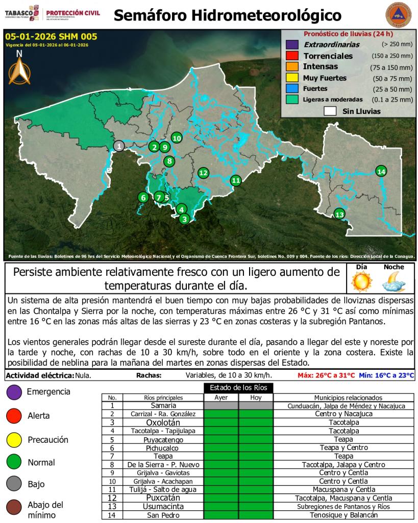 Noticias Compartir en: ¡Enlace copiado! Público General | 5 Enero, 2026 Semáforo Hidrometeorológico y Niveles de Ríos - 05/01/2026 .