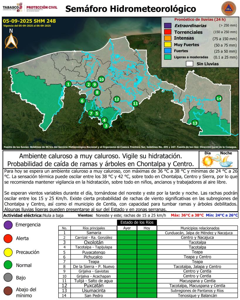Noticias Compartir en: ¡Enlace copiado! Público General | 5 Septiembre, 2025 Semáforo Hidrometeorológico y Niveles de Ríos - 05/09/2025