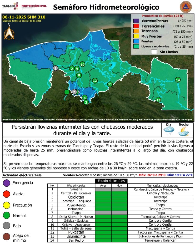 Noticias Compartir en: ¡Enlace copiado! Público General | 6 Noviembre, 2025 Semáforo Hidrometeorológico y Niveles de Ríos - 06/11/2025