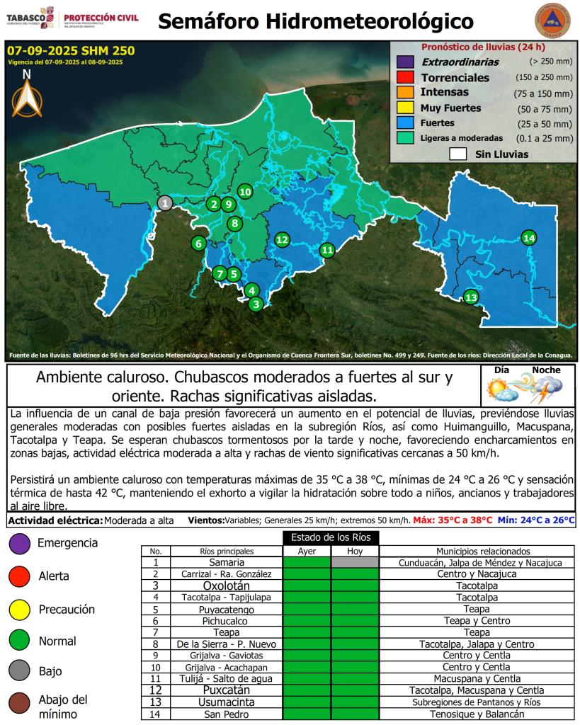 Noticias Compartir en: ¡Enlace copiado! Público General | 7 Septiembre, 2025 Semáforo Hidrometeorológico y Niveles de Ríos - 07/09/2025