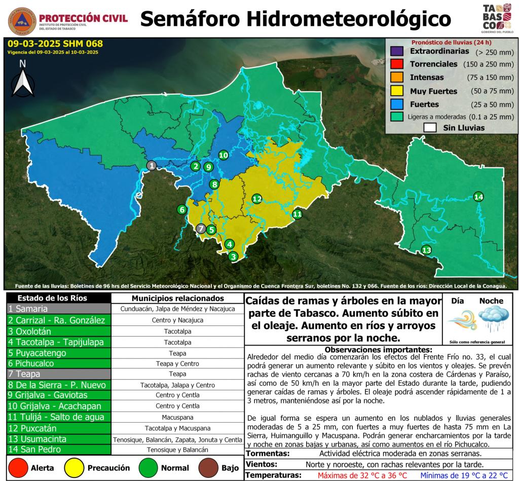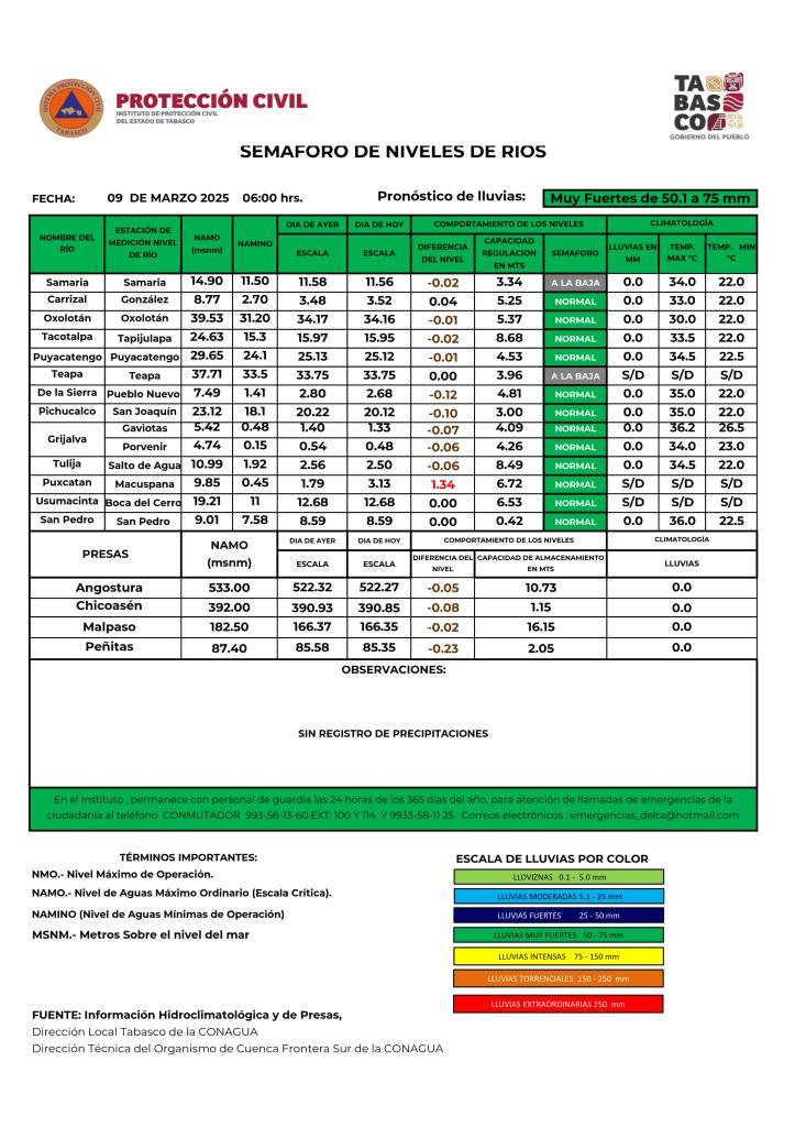 Noticias Compartir en: ¡Enlace copiado! Público General | 9 Marzo, 2025 Semáforo Hidrometeorológico y Niveles de Ríos - 09/03/2025