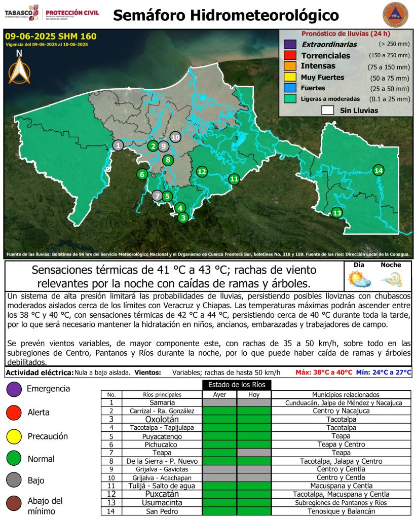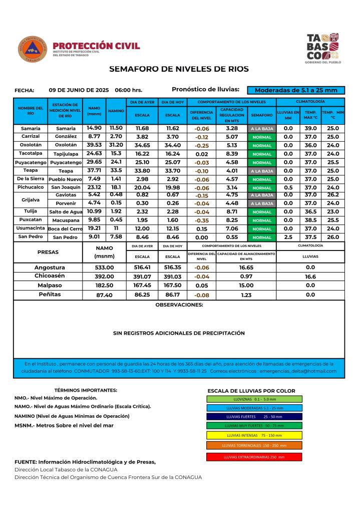 Noticias Compartir en: ¡Enlace copiado! Público General | 9 Junio, 2025 Semáforo Hidrometeorológico y Niveles de Ríos - 09/06/2025
