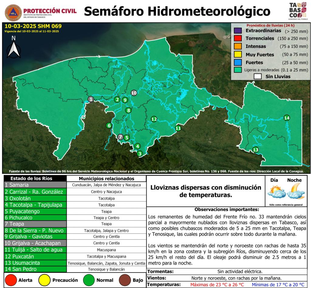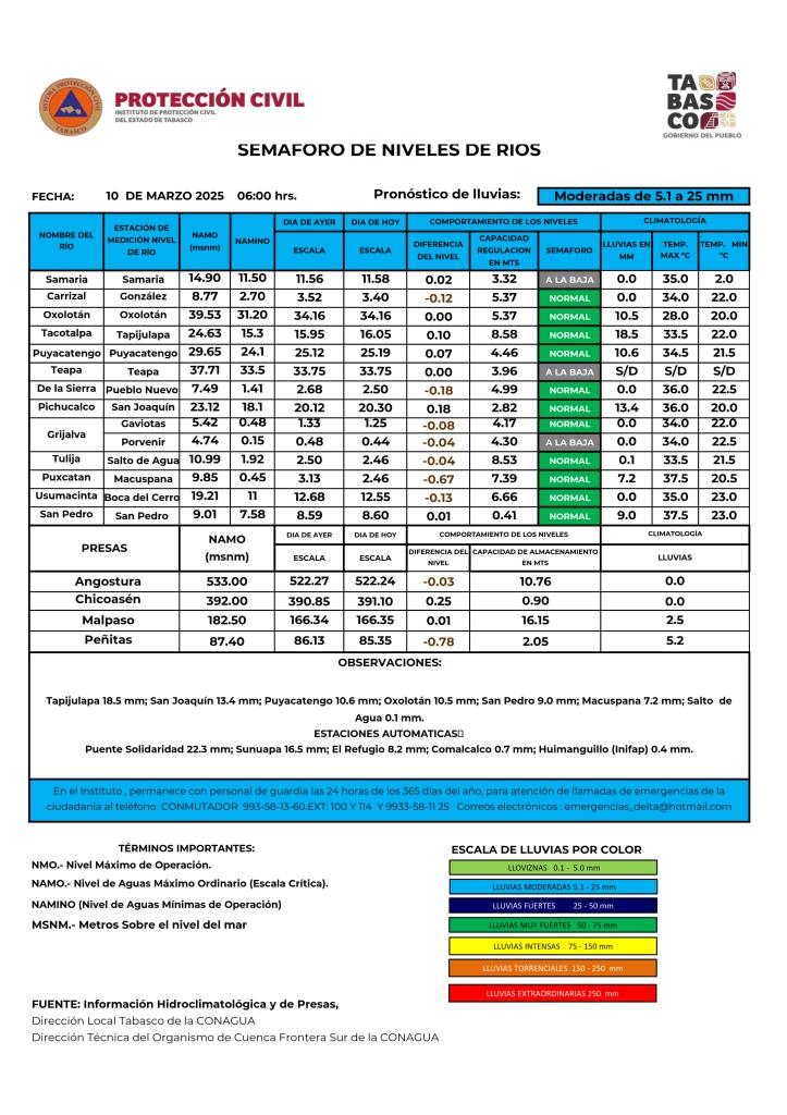 Noticias Compartir en: ¡Enlace copiado! Público General | 10 Marzo, 2025 Semáforo Hidrometeorológico y Niveles de Ríos - 10/03/2025