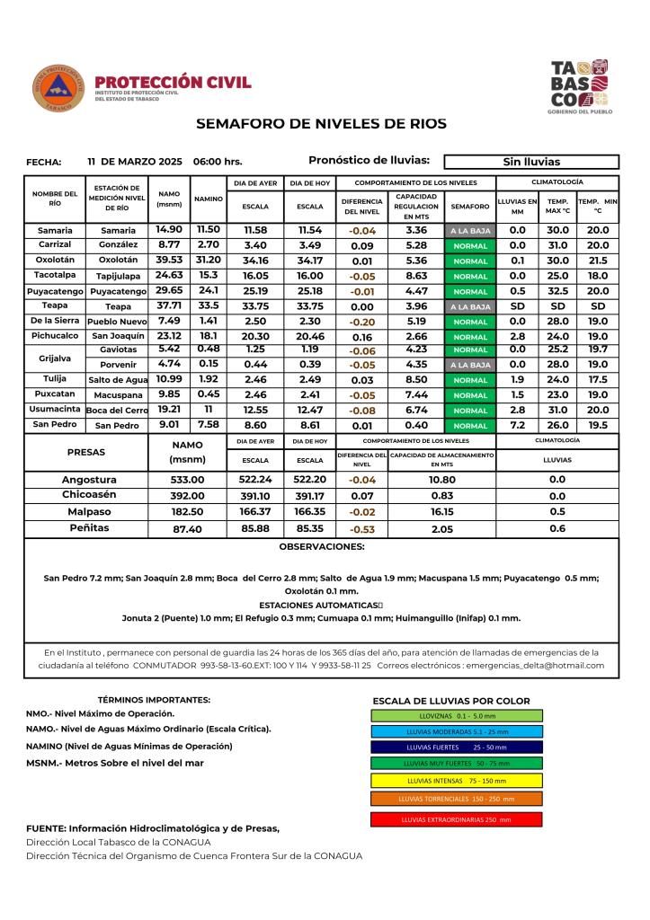 Noticias Compartir en: ¡Enlace copiado! Público General | 11 Marzo, 2025 Semáforo Hidrometeorológico y Niveles de Ríos - 11/03/2025