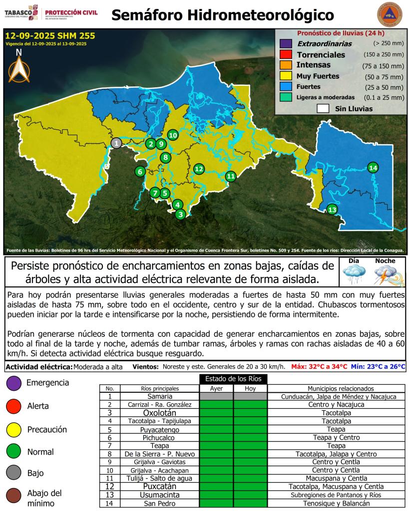 Noticias Compartir en: ¡Enlace copiado! Público General | 12 Septiembre, 2025 Semáforo Hidrometeorológico y Niveles de Ríos - 12/09/2025