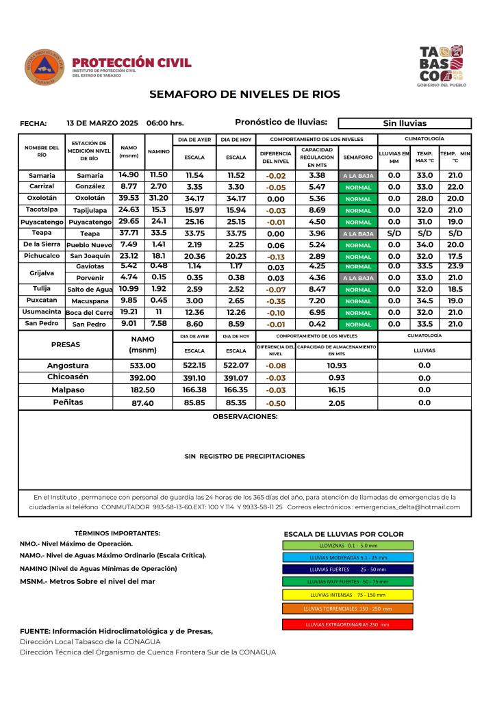 Noticias Compartir en: ¡Enlace copiado! Público General | 13 Marzo, 2025 Semáforo Hidrometeorológico y Niveles de Ríos - 13/03/2025