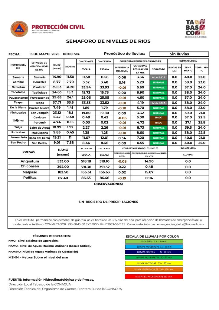 Noticias Compartir en: ¡Enlace copiado! Público General | 15 Mayo, 2025 Semáforo Hidrometeorológico y Niveles de Ríos - 15/05/2025