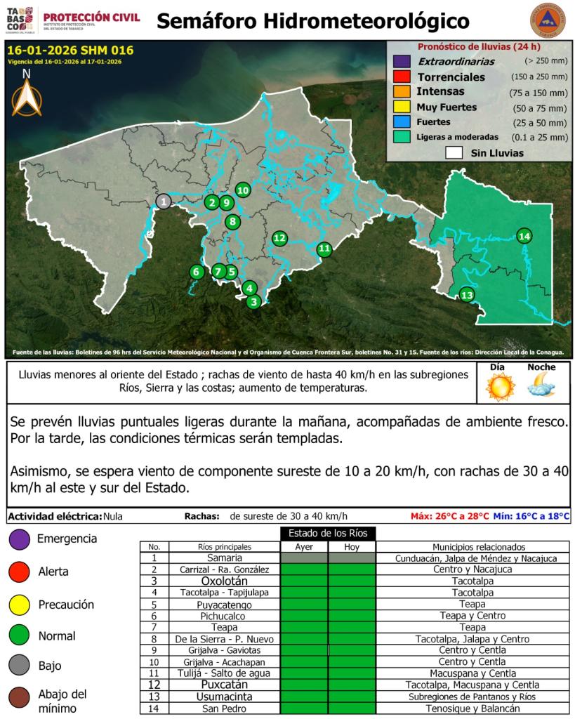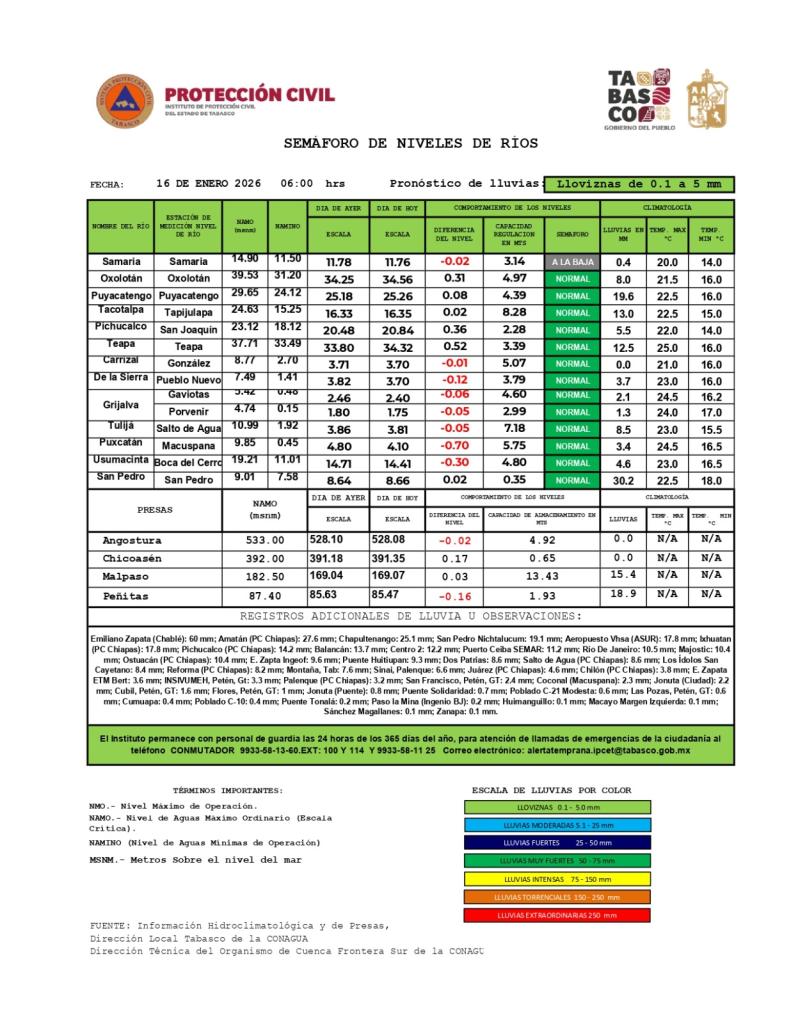 Noticias Compartir en: ¡Enlace copiado! Público General | 16 Enero, 2026 Semáforo Hidrometeorológico y Niveles de Ríos - 16/01/2026