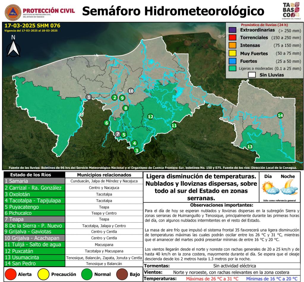 Noticias Compartir en: ¡Enlace copiado! Público General | 17 Marzo, 2025 Semáforo Hidrometeorológico y Niveles de Ríos - 17/03/2025