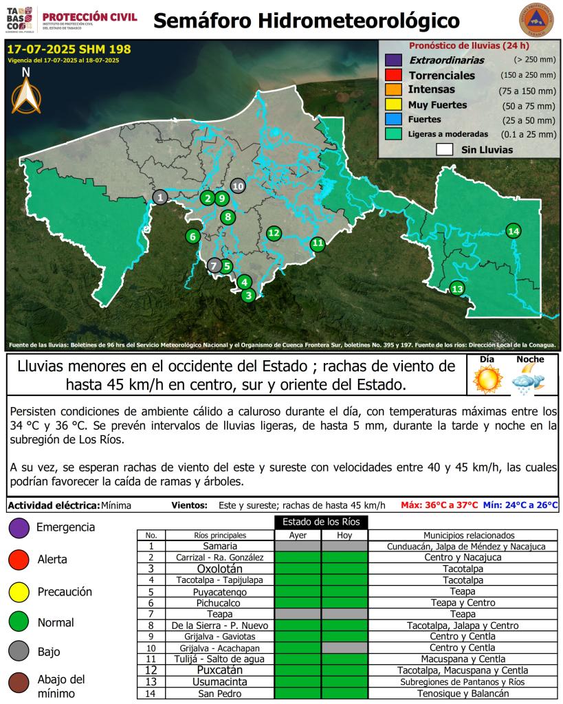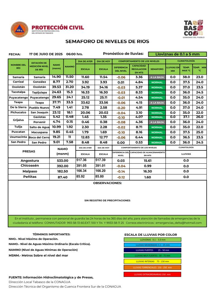 Noticias Compartir en: ¡Enlace copiado! Público General | 17 Julio, 2025 Semáforo Hidrometeorológico y Niveles de Ríos - 17/07/2025