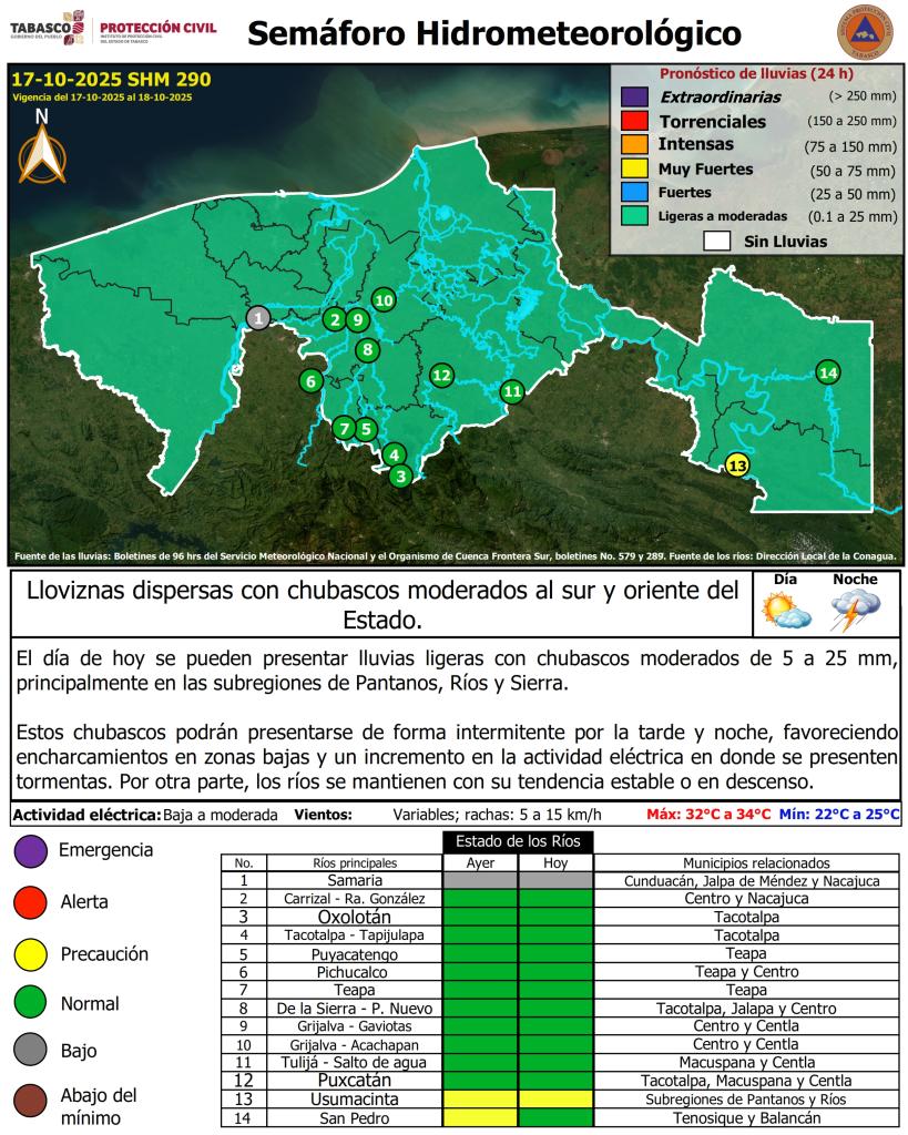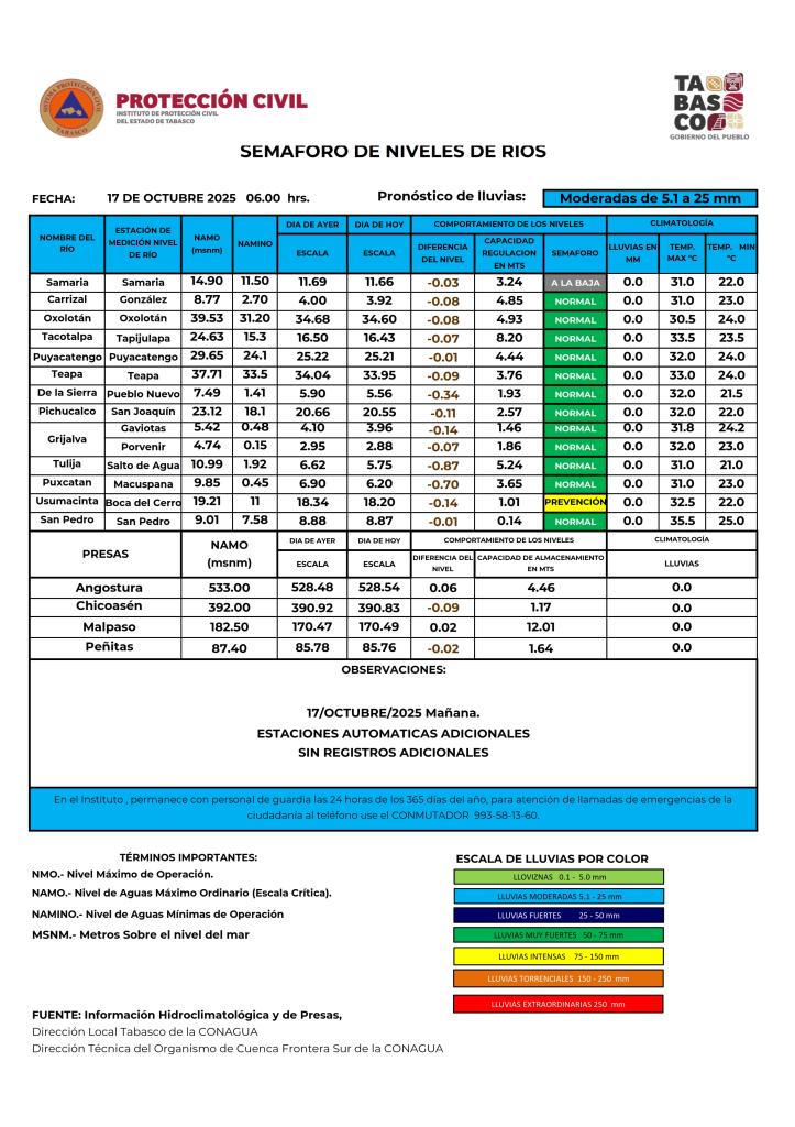 Noticias Compartir en: ¡Enlace copiado! Público General | 17 Octubre, 2025 Semáforo Hidrometeorológico y Niveles de Ríos - 17/10/2025