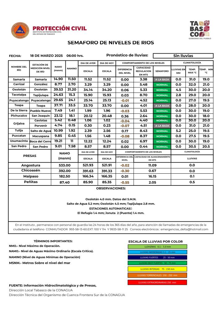 Noticias Compartir en: ¡Enlace copiado! Público General | 18 Marzo, 2025 Semáforo Hidrometeorológico y Niveles de Ríos - 18/03/2025