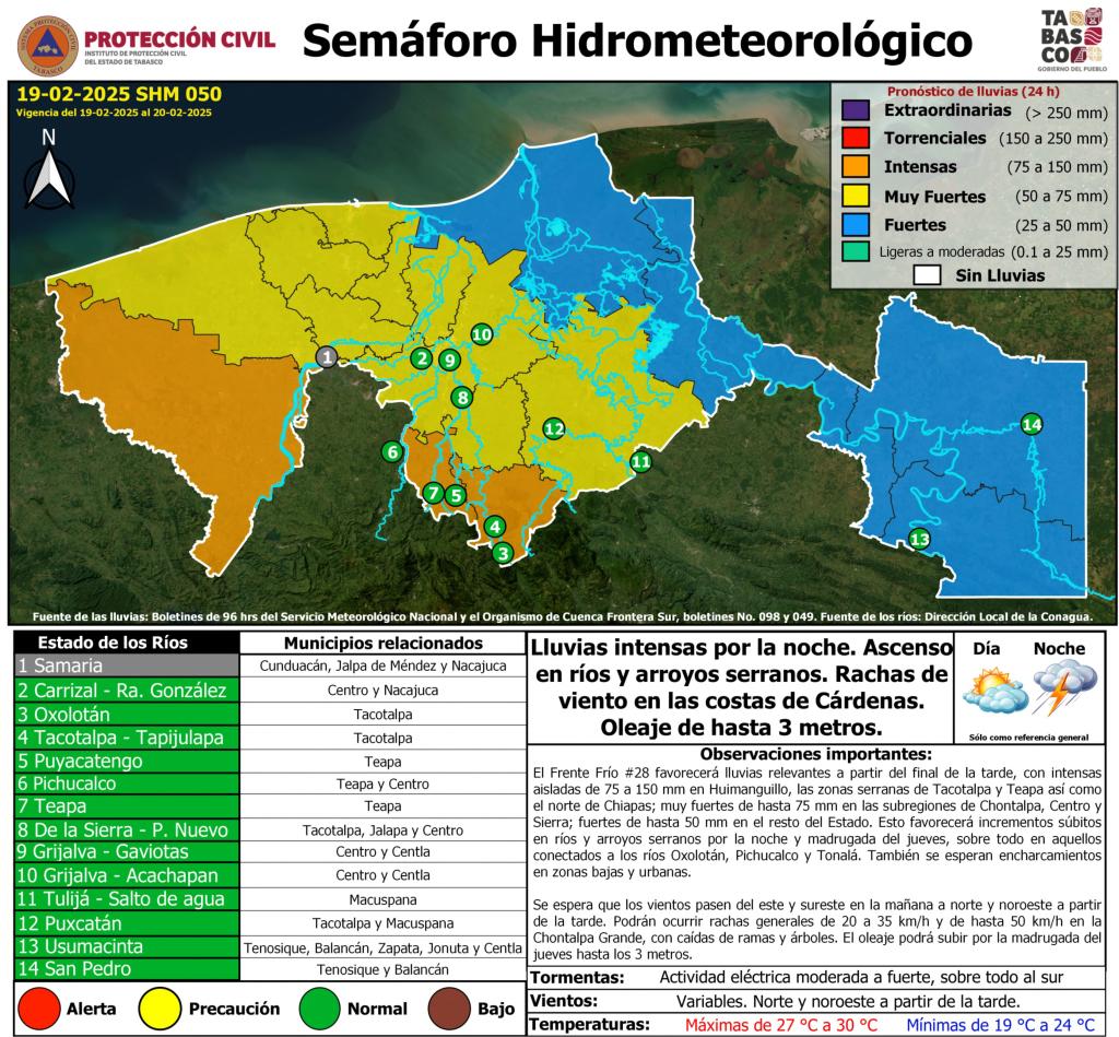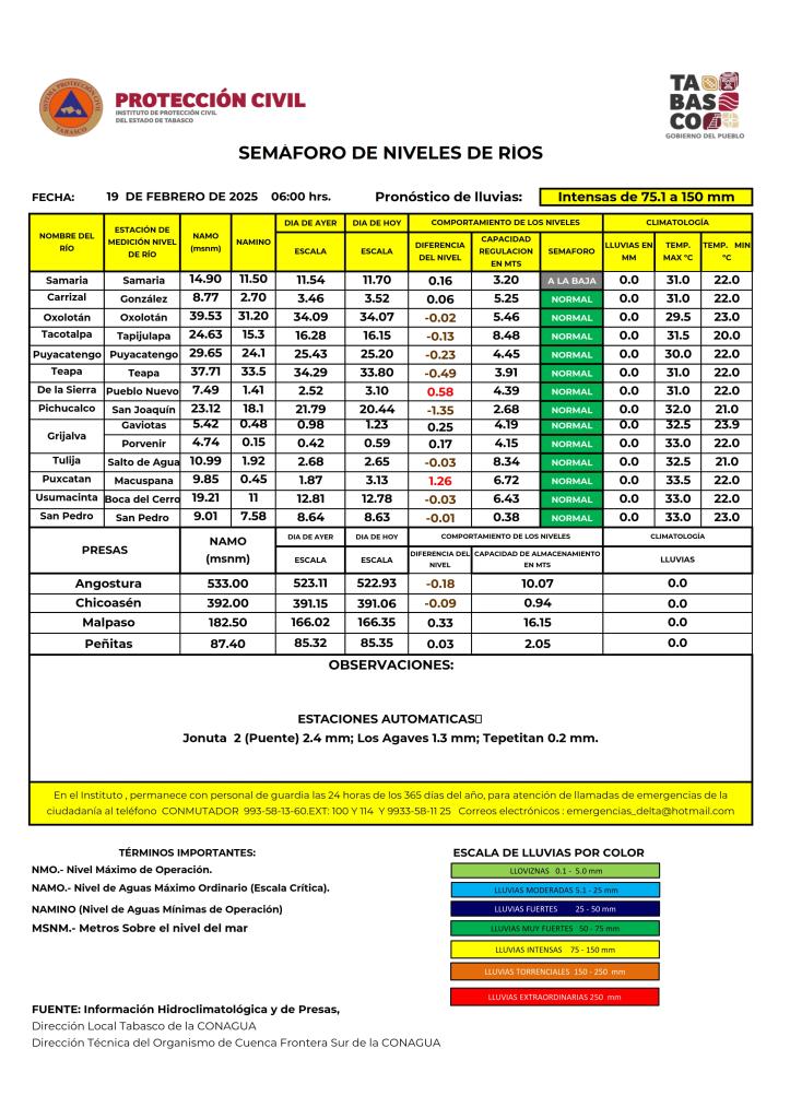 Noticias Compartir en: ¡Enlace copiado! Público General | 19 Febrero, 2025 Semáforo Hidrometeorológico y Niveles de Ríos - 19/02/2025
