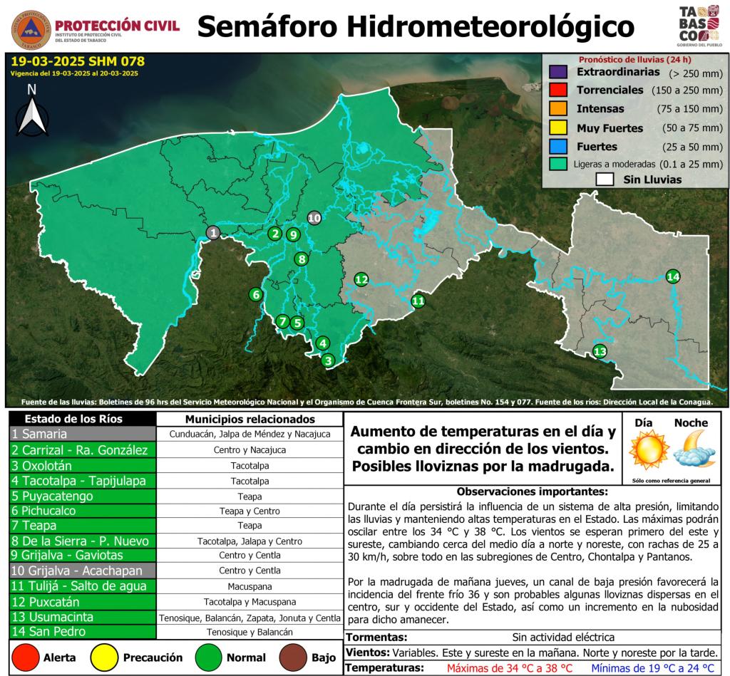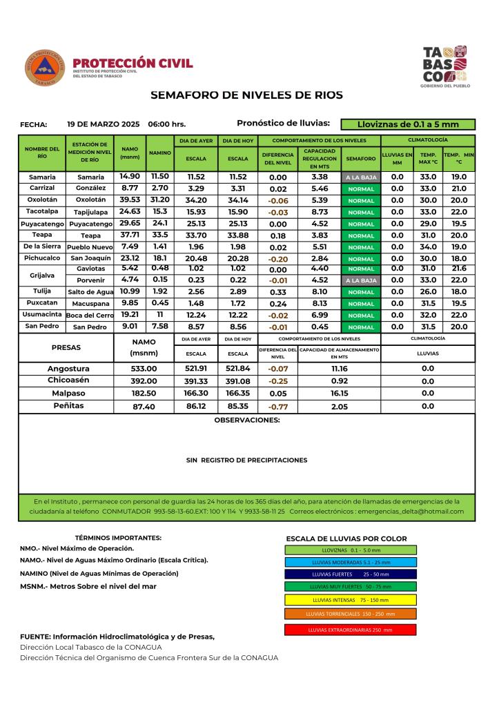 Noticias Compartir en: ¡Enlace copiado! Público General | 19 Marzo, 2025 Semáforo Hidrometeorológico y Niveles de Ríos - 19/03/2025