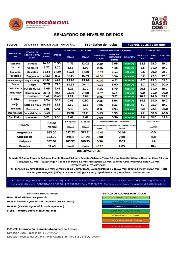 Noticias Compartir en: ¡Enlace copiado! Público General | 21 Febrero, 2025 Semáforo Hidrometeorológico y Niveles de Ríos - 21/02/2025