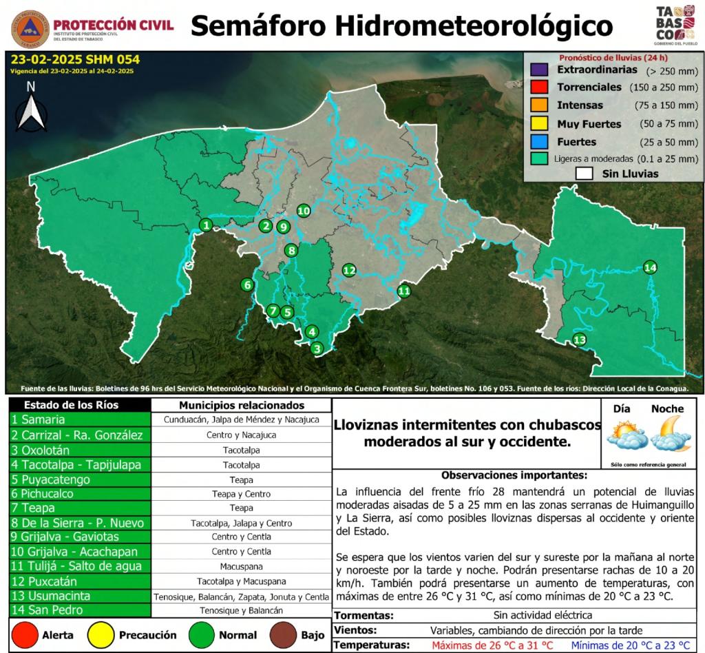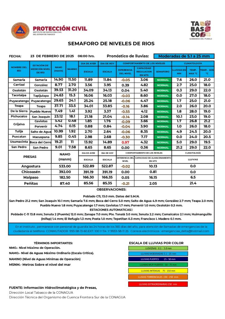 Noticias Compartir en: ¡Enlace copiado! Público General | 23 Febrero, 2025 Semáforo Hidrometeorológico y Niveles de Ríos - 23/02/2025