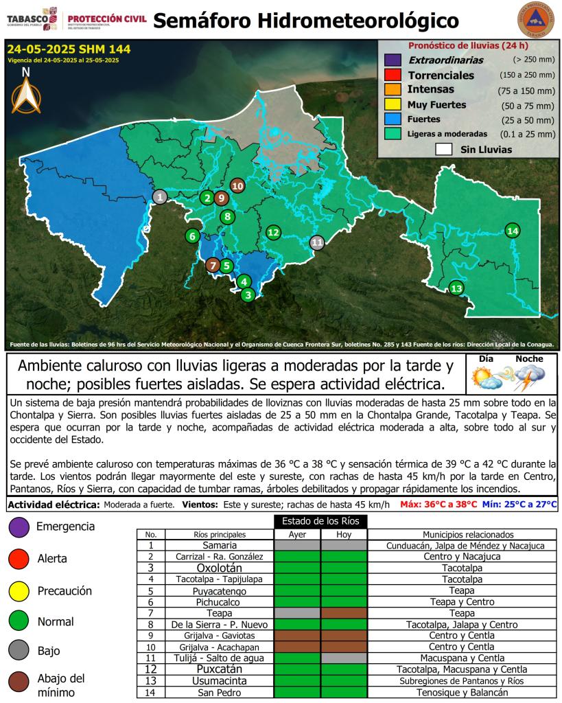 Noticias Compartir en: ¡Enlace copiado! Público General | 24 Mayo, 2025 Semáforo Hidrometeorológico y Niveles de Ríos - 24/05/2025