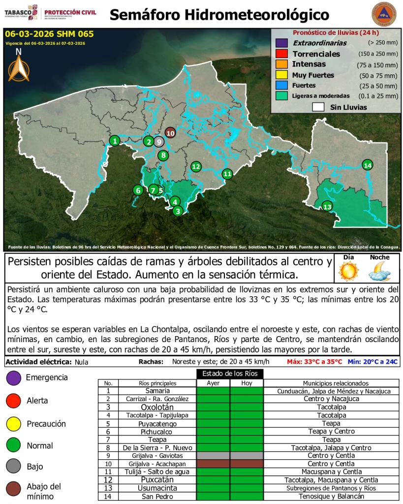 Noticias Compartir en: ¡Enlace copiado! Público General | 6 Marzo, 2026 Semáforo Hidrometereológico y Niveles de Ríos - 06/03/2026