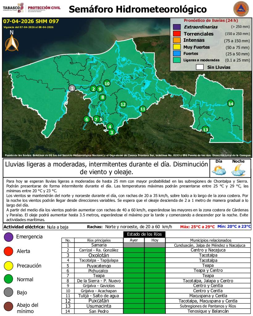 Noticias Compartir en: ¡Enlace copiado! Público General | 7 Abril, 2026 Semáforo Hidrometereológico y Niveles de Ríos - 07/04/2026