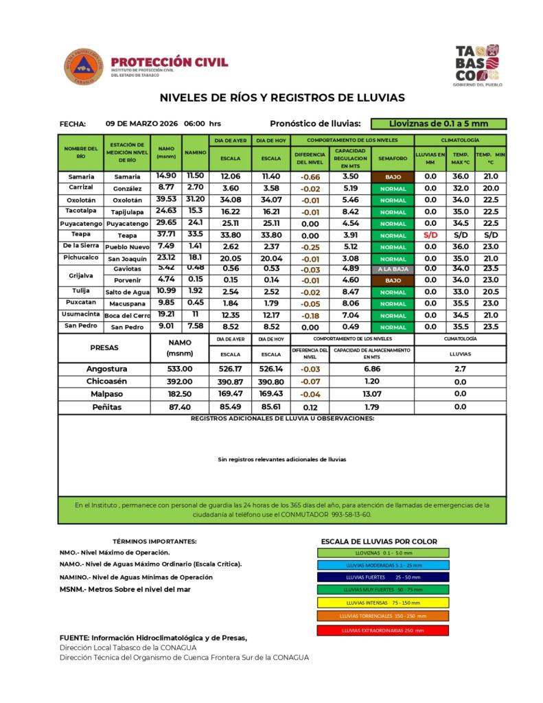Noticias Compartir en: ¡Enlace copiado! Público General | 9 Marzo, 2026 Semáforo Hidrometereológico y Niveles de Ríos - 09/03/2026