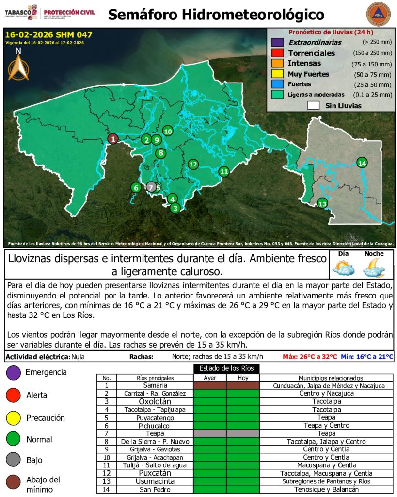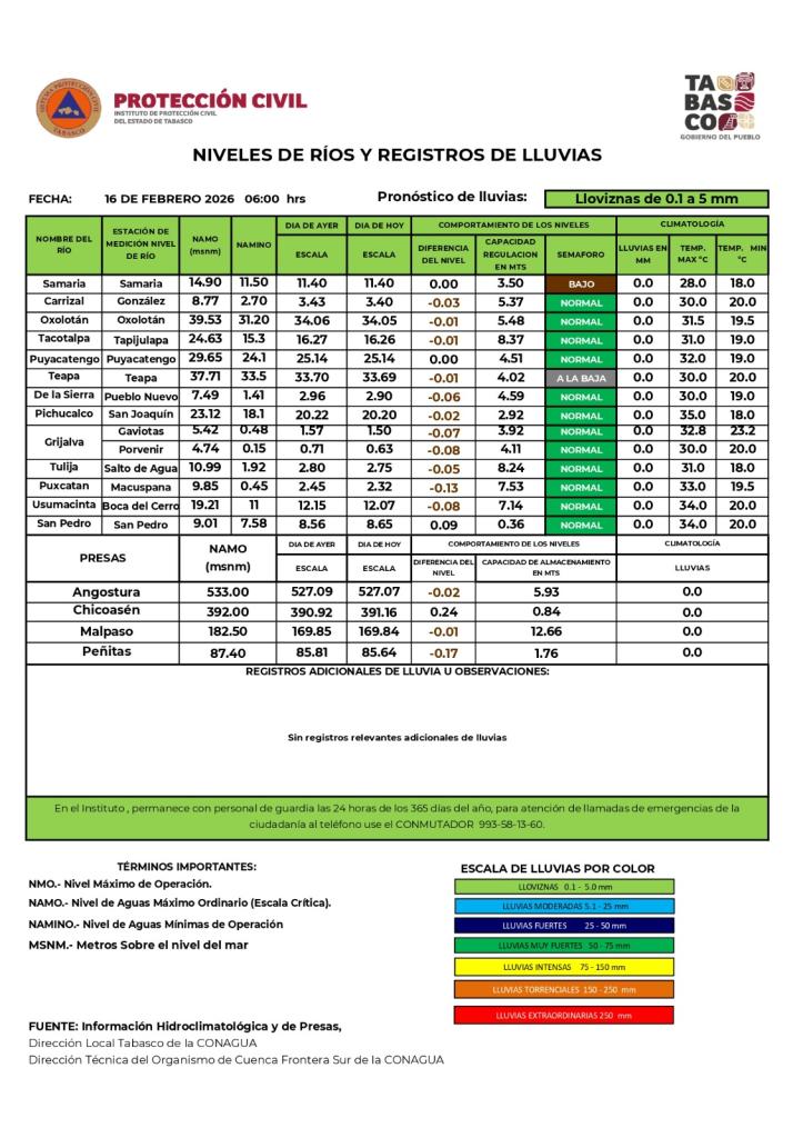 Noticias Compartir en: ¡Enlace copiado! Público General | 16 Febrero, 2026 Semáforo Hidrometereológico y Niveles de Ríos - 16/02/2026