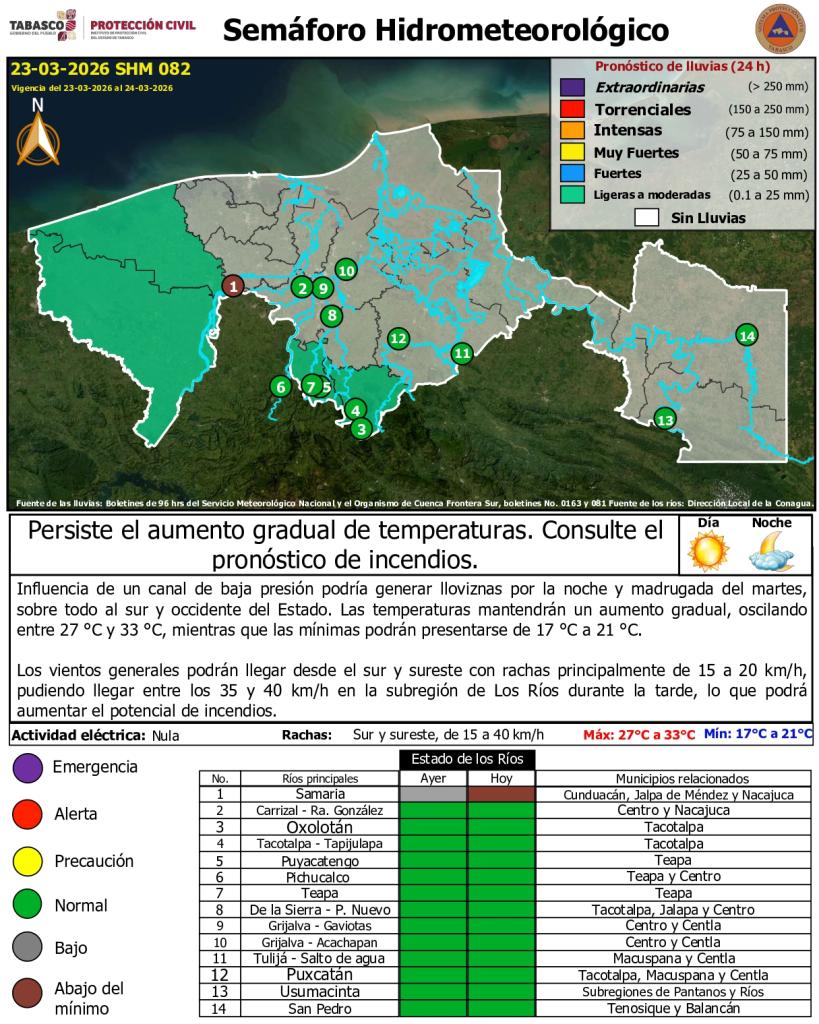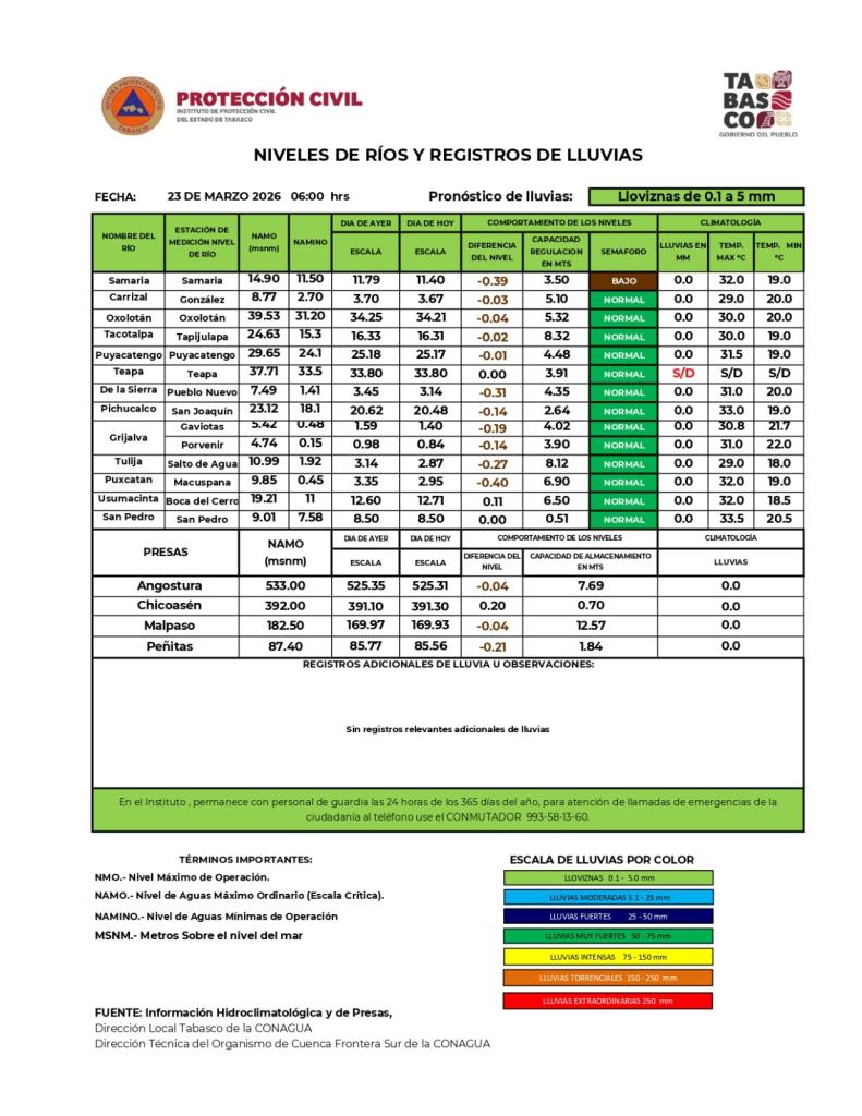 Noticias Compartir en: ¡Enlace copiado! Público General | 23 Marzo, 2026 Semáforo Hidrometereológico y Niveles de Ríos - 23/03/2026