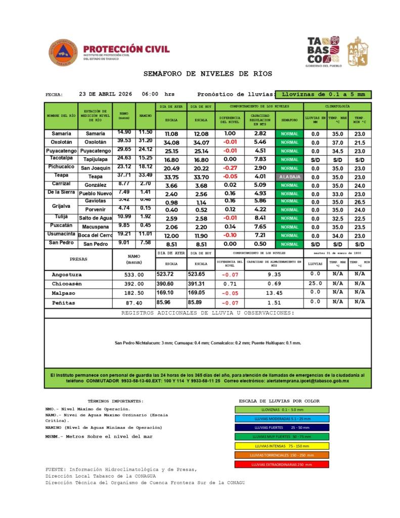 Noticias Compartir en: ¡Enlace copiado! Público General | 23 Abril, 2026 Semáforo Hidrometereológico y Niveles de Ríos - 23/04/2026