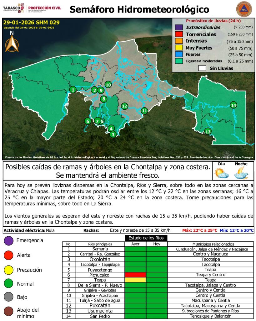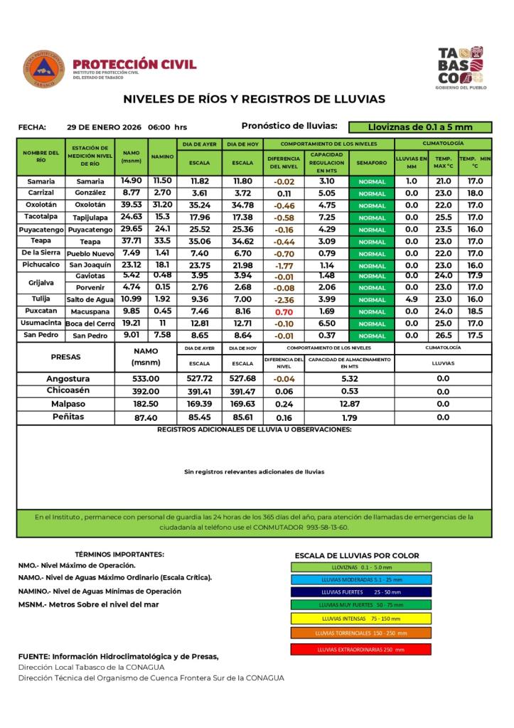 Noticias Compartir en: ¡Enlace copiado! Público General | 29 Enero, 2026 Semáforo Hidrometereológico y Niveles de Ríos - 29/01/2026
