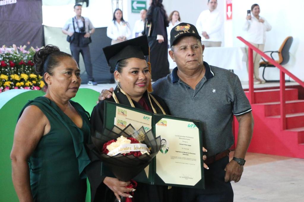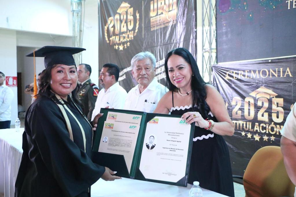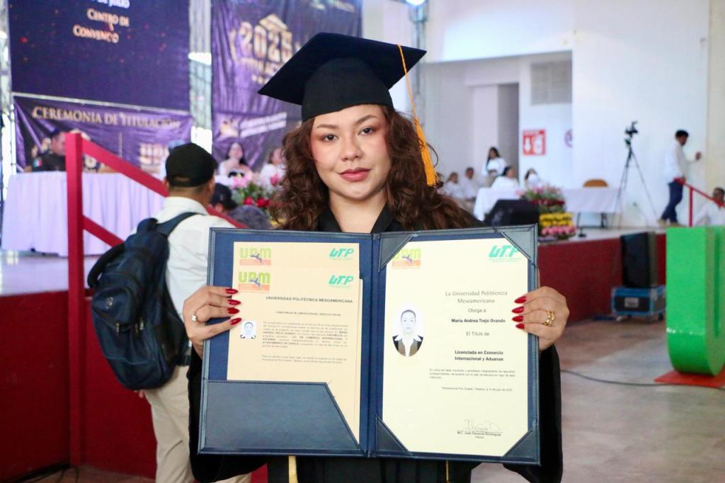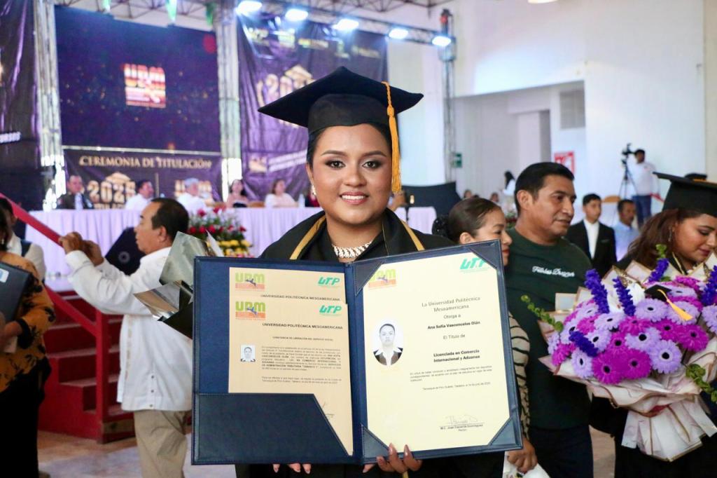 La secretaria de Educación del Estado de Tabasco, Patricia Iparrea Sánchez, encabezó la ceremonia de graduación de la Generación 2019-2025 de la Universidad Politécnica Mesoamericana (UPM), donde exhortó a las y los egresados a convertirse en los profesionistas comprometidos que el país demanda y que el mundo actual requiere para enfrentar sus desafíos.